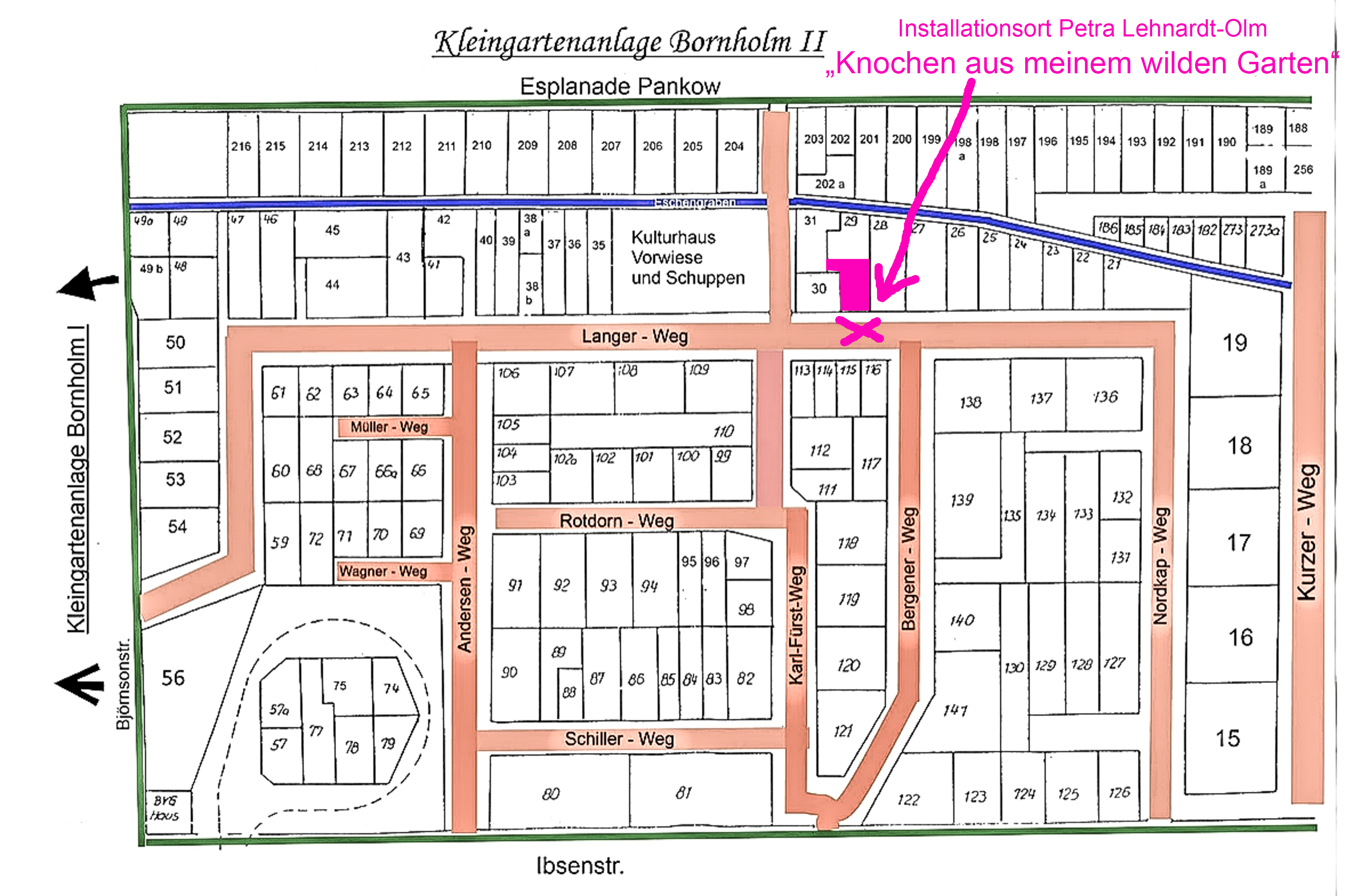 In der Parzelle 29 der KGA Bornholm II (Lageplan hier) zeige ich die Installation "Knochen aus meinem wilden Garten". Die Installation entsteht zeitnah improvisiert sowie ortsbezogen. Aus Tierknochen, eingebettet in die Natur dieses Kleingartens.